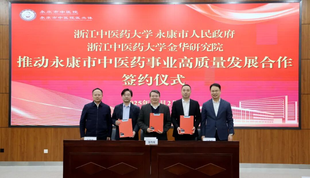 在浙江中医药大学校长陈忠,永康市委副书记、市长郑云涛的共同见证下,浙江中医药大学副校长、浙江中医药大学金华研究院院长温成平,永康市副市长马海华,浙江中医药大学金华研究院执行院长寿旗扬代表三方签署合作协议。