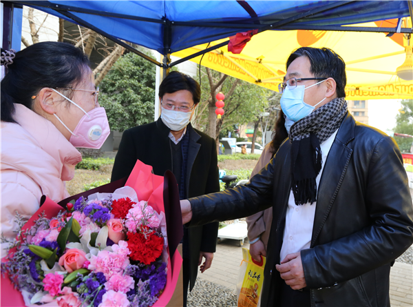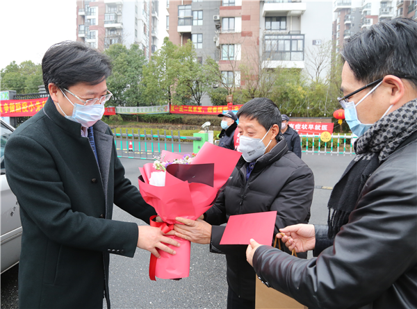 在小区门口,院领导分别向四位医务工作者的家属送上慰问物品和鲜花,并与他们亲切交谈。院领导嘱咐他们,要辛苦大家照顾好家里老人和小孩,生活上有需要、有困难要第一时间向医院反映。医院将全力做好保障支持工作。希望他们守好后方阵地,卸下后顾之忧,与前线人员保持密切联系。