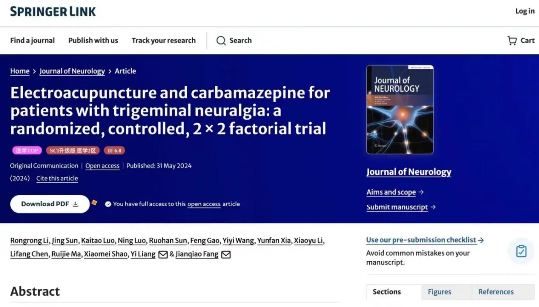 J Neurology | 附属三院方剑乔教授和梁宜研究员团队证实电针治疗三叉神经痛有效