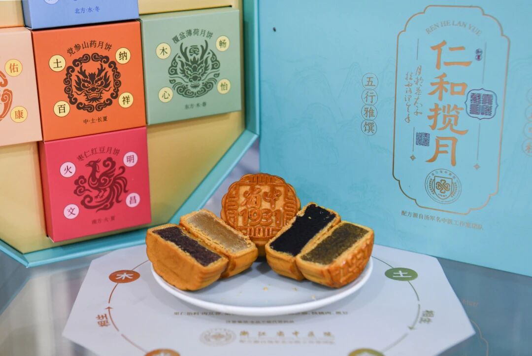 附属一院浙江省中医院将药膳与传统糕点相结合,全新推出五行药膳月饼,以药食同源中药材为核心,低油低糖,共有青赤黄白黑五种款式,分别对应木火土金水和肝心脾肺肾,让不同人群都能安心过嘴瘾。