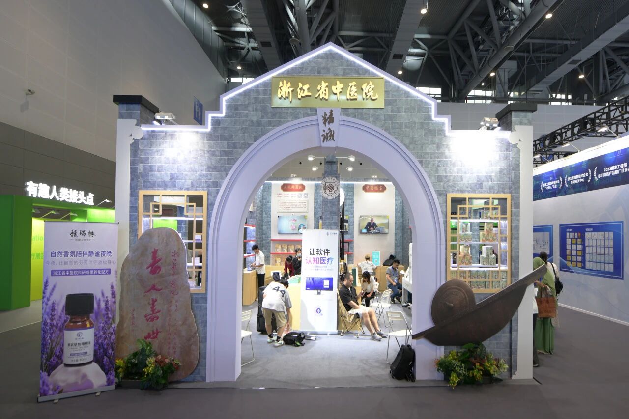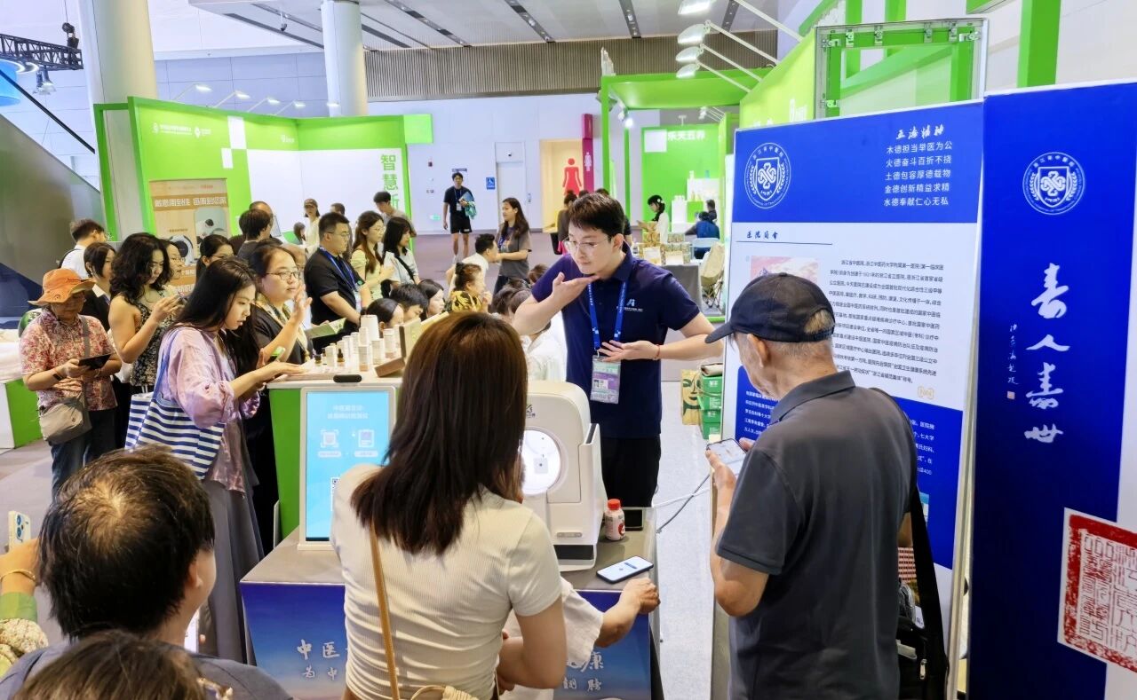 附属一院浙江省中医院携“AI中医智能体质辨识仪”“系列中药复方精油”“乌梅荷叶系列茶饮”“五行药膳月饼”“五行香囊”等多项科研成果参展,展区体验区、义诊区热闹非凡,传统中医药与现代科技的融合成果成为焦点。