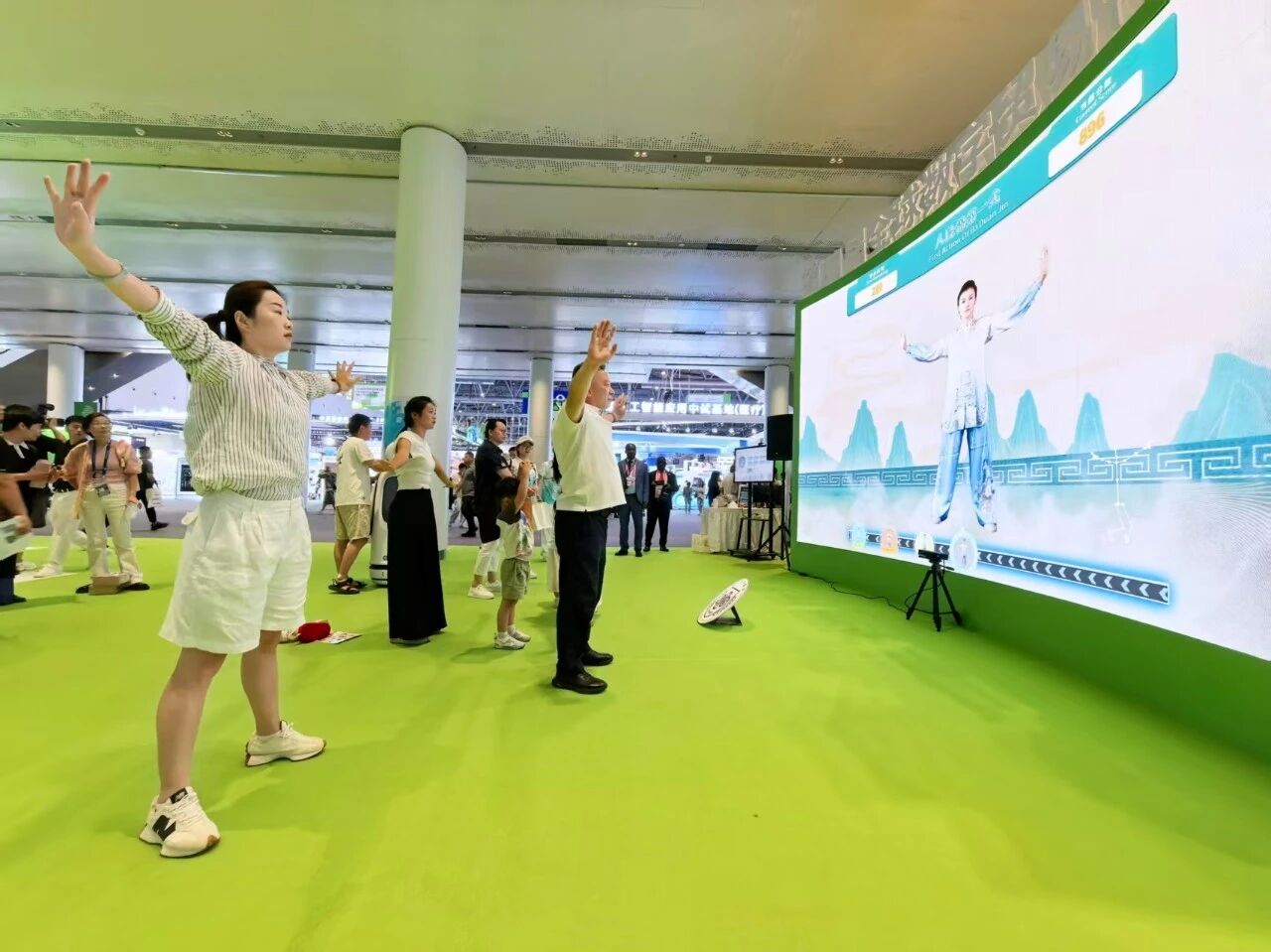 抬手间,虚拟竹林随风轻舞;收势时,脚下似泛起粼粼波光。一套“中医体感数字互动”系统正引领观众学习养生功法八段锦。观众通过体感交互技术,在AI教练的精准指导习练八段锦功法,系统即时生成的评分反馈,让传统养生焕发数字活力。